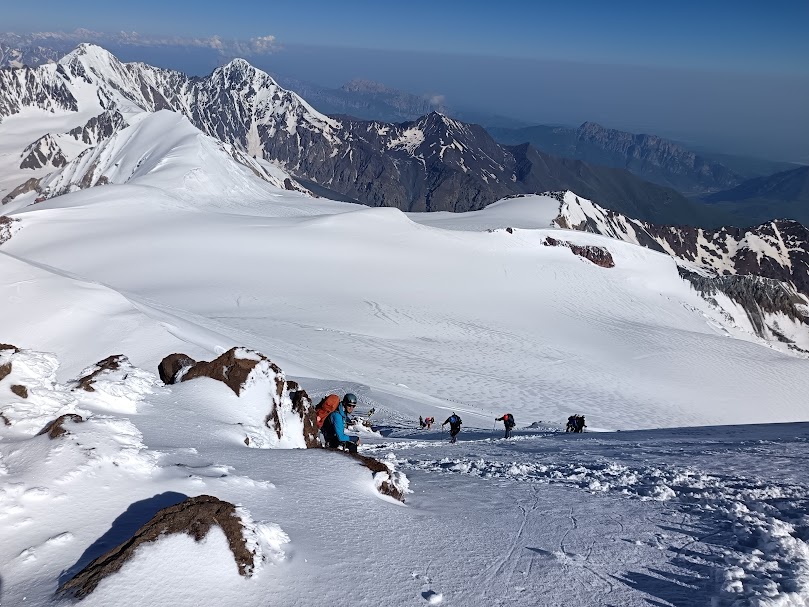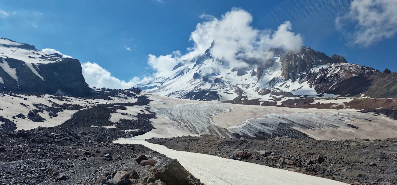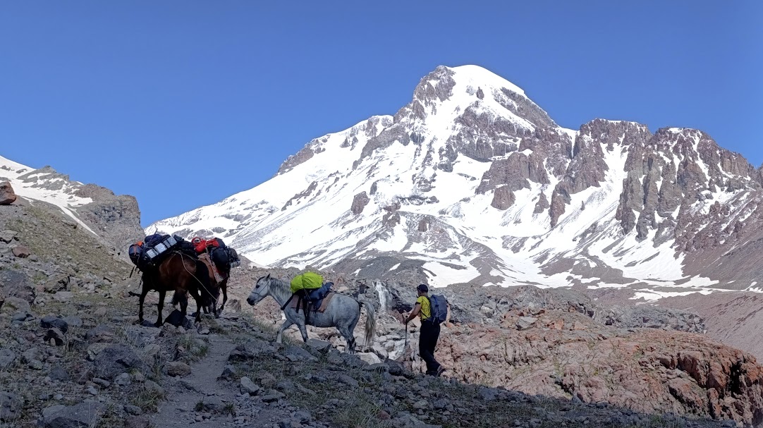 ▶ Ziua 4: Începem ascensiunea propriu-zisă. În prima zi urcăm de la Stepantsminda (1750 m) la Zeliyonaya Polyana (3000 m). Ne cazăm (la cabana Altihut sau la cort), apoi facem o urcare ușoară de aclimatizare.