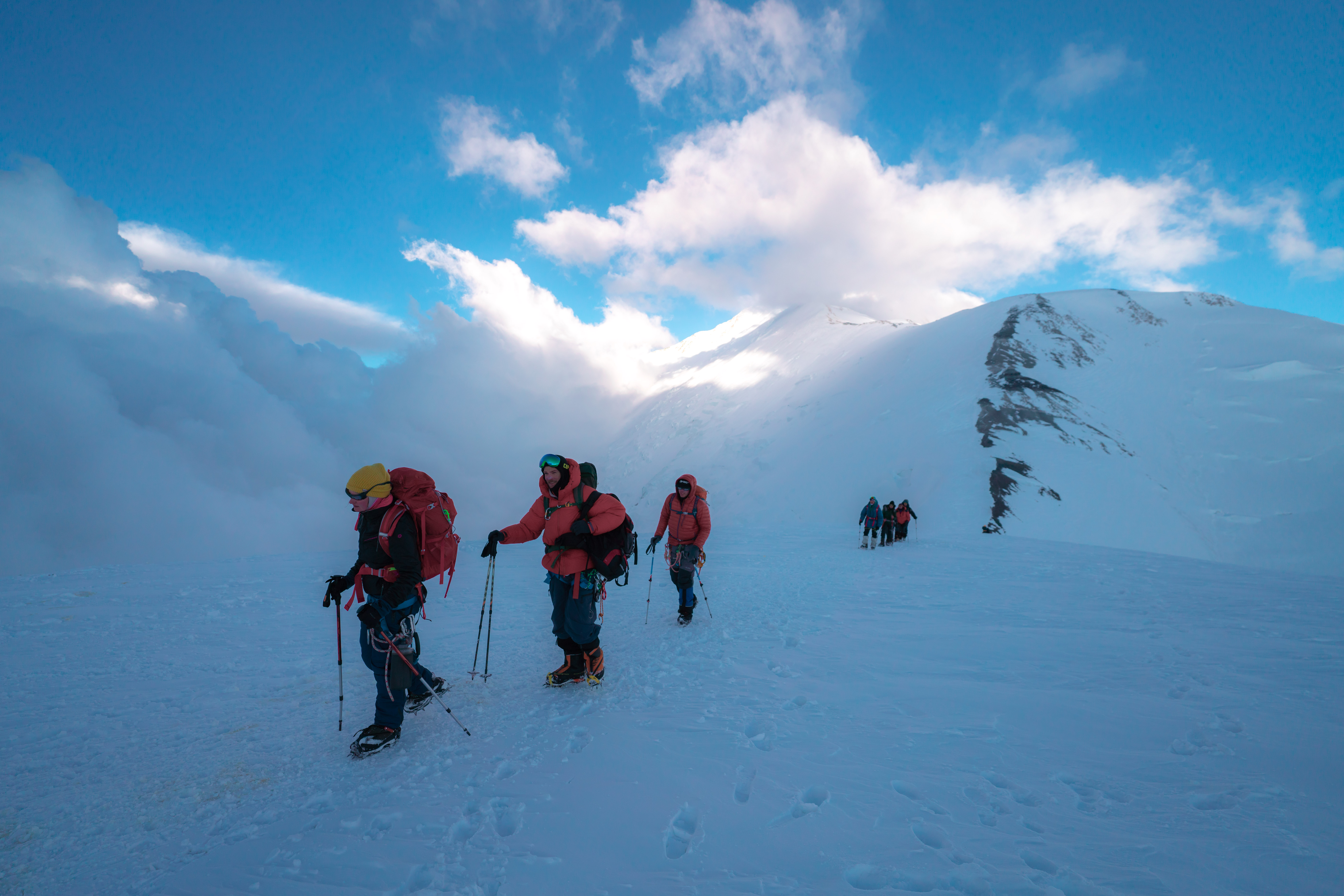▶ Ziua 9: Urcare către Tabăra 3 (6.100 m) - Plecare la ora 9:00 dimineața. Deplasarea se face cu colțarii și în coardă. După depășirea urcării abrupte, traseul continuă pe creasta nord-vestică mai lină. Apoi se virează stânga pe creastă până la urcarea abruptă spre vârful Razdelnaia. Tabăra 3 se află pe un dom spațios al vârfului, la altitudinea de 6.100 m. Traseul de la Tabăra 2 la Tabăra 3 durează aproximativ 4–6 ore.