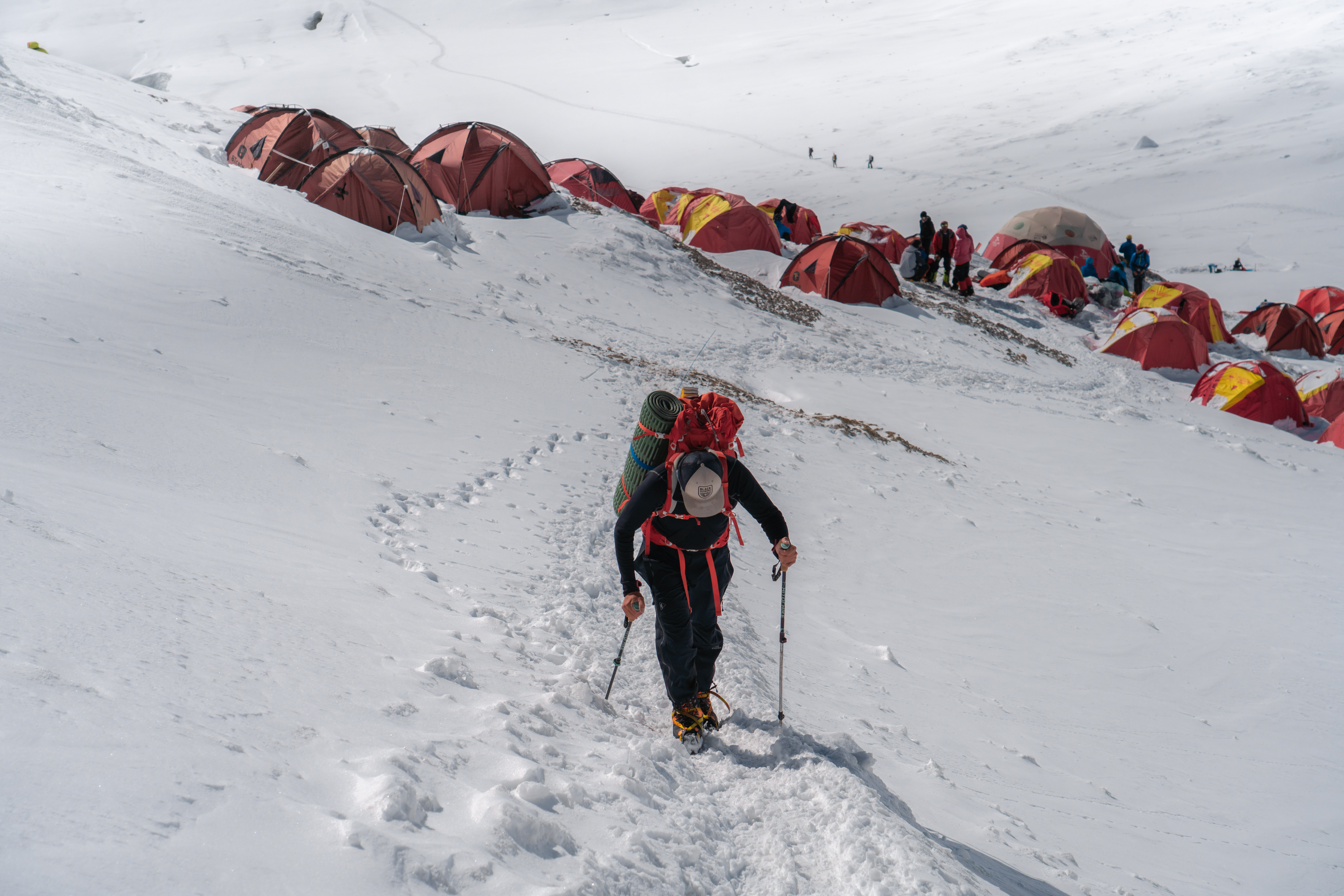 ▶ Ziua 8: Urcare către Tabăra 2 (5.300 m) - De la Tabăra 1 până la Tabăra 2 pornim cu o oră înainte de răsărit, pentru a evita căldura și zăpada umedă. După ce traversăm morena și ajungem la baza versantului nordic, trecem la deplasarea în coardă și ne punem colțarii. Urmează urcarea pe centrul versantului nordic abrupt, la stânga cascadei de gheață, unde se întâlnesc numeroase crevase. Cele mai dificile și periculoase sectoare sunt echipate cu frânghii fixe. În partea superioară, traseul virează spre dreapta către un platou vast de gheață, cunoscut sub numele de „Tigaia”. Tabăra 2 se află pe o morenă superficială, la baza crestei nord-vestice, la altitudinea de 5.300 m.