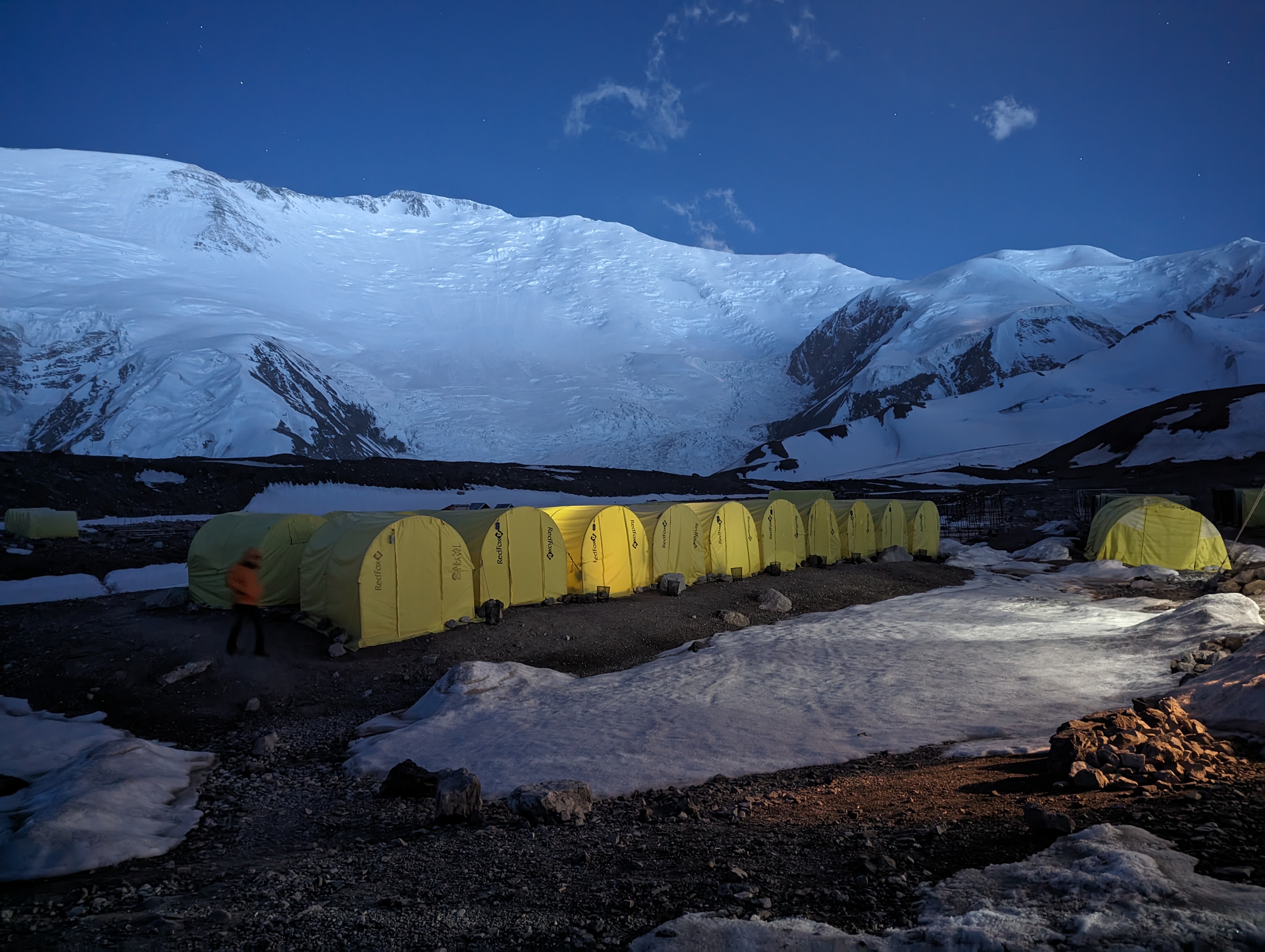 ▶ Ziua 10: Coborâre către Tabăra de Bază Aci̦k-Taș (3.600 m) - De dimineață devreme începe coborârea din Tabăra 3 către Tabăra 1. Deplasarea se face cu colțarii și în coardă. La sosire – prânz la Tabăra 1, după care continuăm coborârea către Tabăra de Bază Aci̦k-Taș. Seara – cină la tabăra de bază și odihnă după o zi plină.