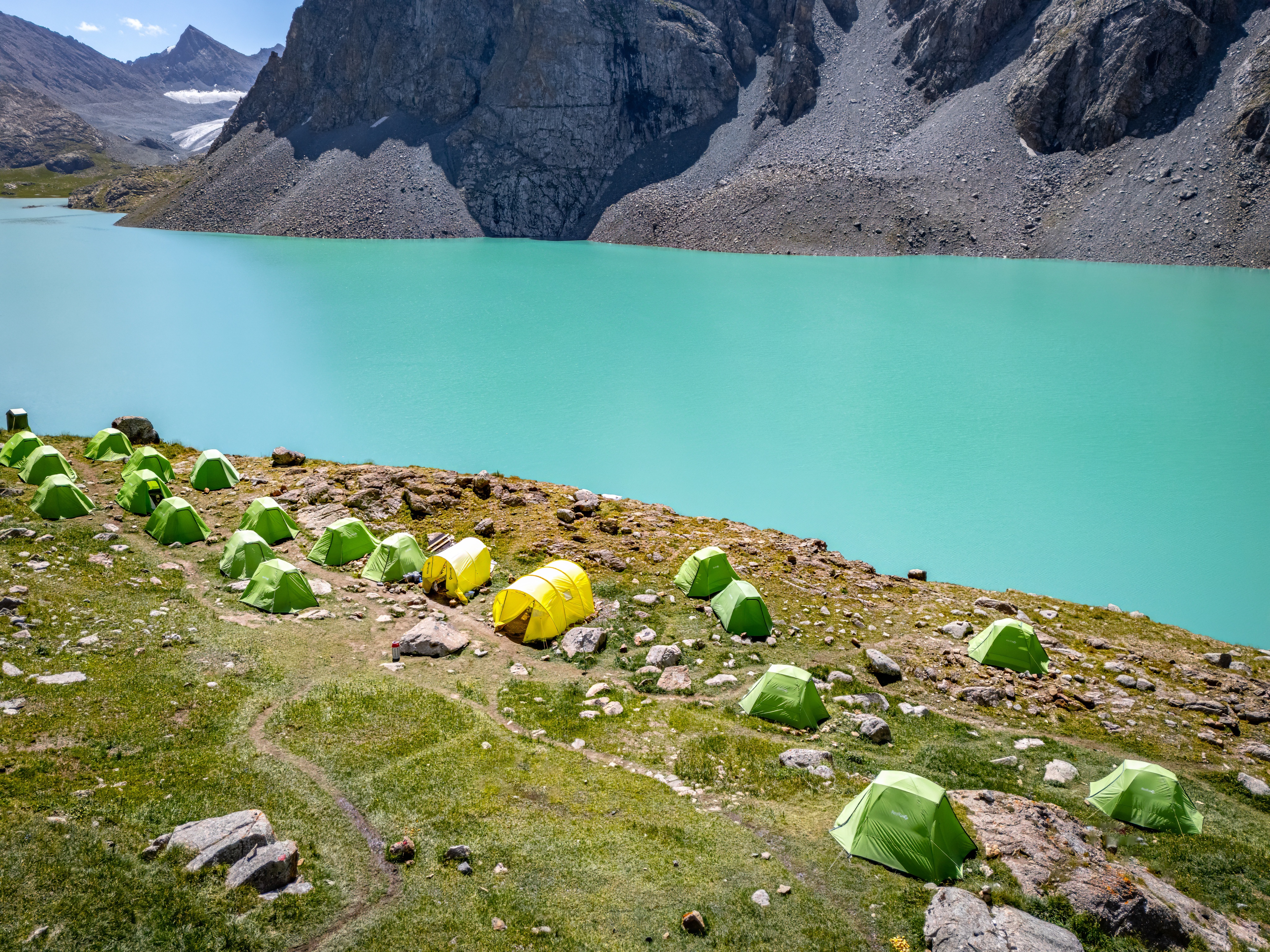 ▶ День 7. Озеро Ала-Куль – ущелье Алтын-Арашан - Озеро Ала-Куль – моренное озеро длиной 2,8 км и шириной около 500 м, с глубиной до 70 м. Его название переводится как «Цветное озеро»: в зависимости от погоды и освещения вода меняет оттенки от изумрудно-зелёного и бирюзового до серебристо-серого и даже почти чёрного. После завтрака начинаем подъём на перевал Ала-Куль. С высотой открываются всё более впечатляющие виды на озеро, а на горизонте вырастает главный хребет Терскей Ала-Тоо с вершинами Ак-Суу, Джигит, Каракол, Огуз-Баши и другими. Спуск проходит по осыпному склону, затем через широкую долину Кельдике с живописными лугами. По прибытии в палаточный лагерь можно расслабиться в горячих источниках с температурой воды до +50 °C. Вечером – ужин и ночёвка в палатках.